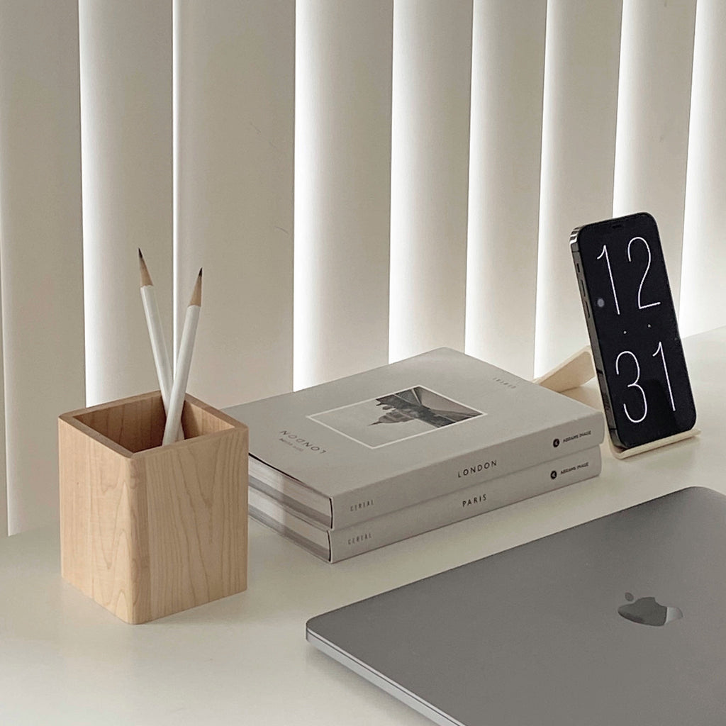 Enkel Studios aims to provide affordable high-quality pieces with functionality and aesthetics in mind. Each pencil holder is crafted from solid birchwood and coated with natural anti-aging/scratch oils. It is hand-sanded to perfection and highlights the natural warmth of the wood.