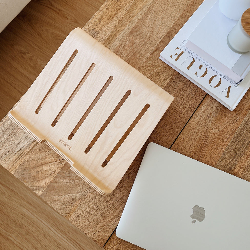 A warm birch wood laptop stand to help improve the ergonomics of your workspace and save you from back and neck pain.